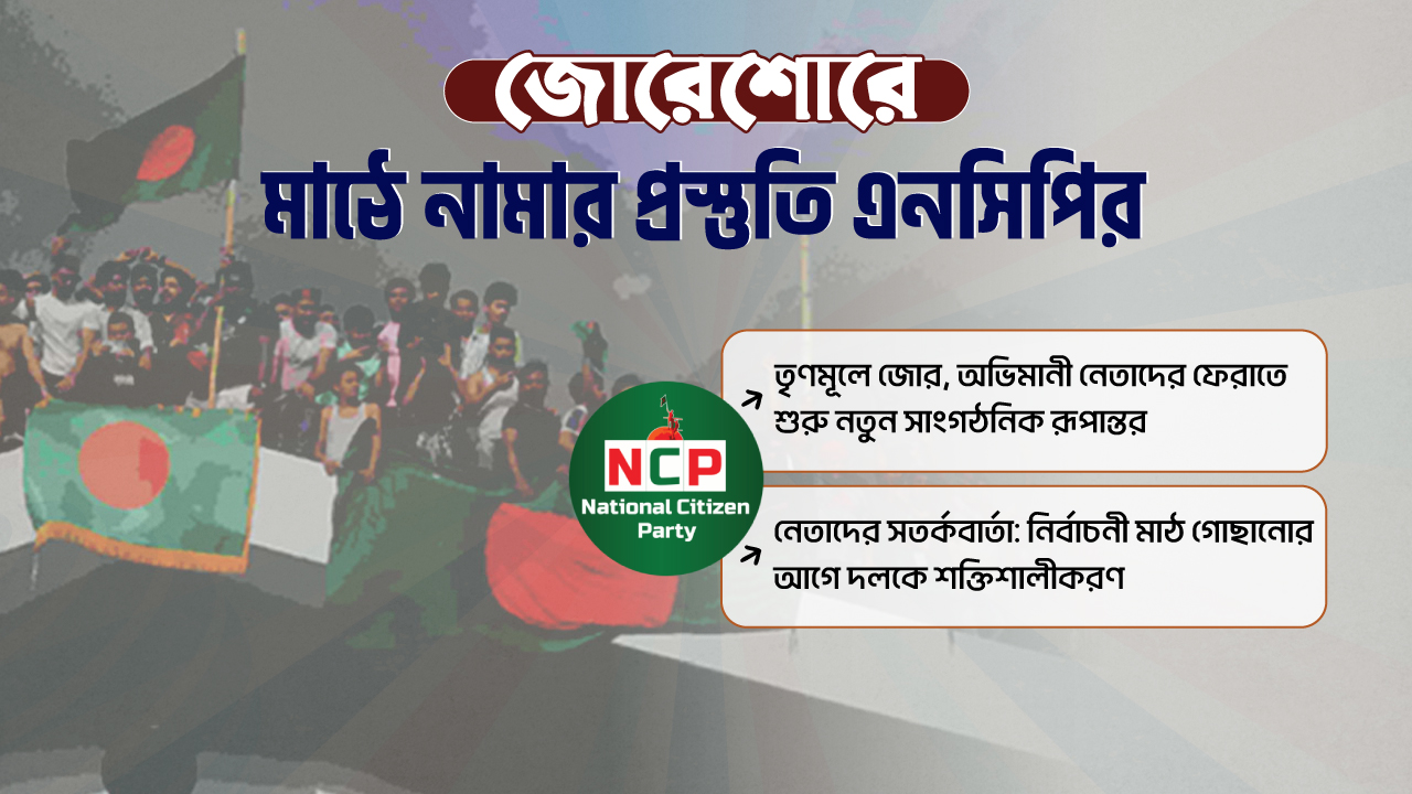 দলটির একাধিক নেতার সঙ্গে আলাপকালে জানা যায়, কেন্দ্রীয় কার্যক্রম চলমান থাকলেও তৃণমূল এখনও সেভাবে গোছানো সম্ভব হয়নি। আসন্ন নির্বাচনের আগে তৃণমূলকে শক্তিশালী করতে অক্টোবর মাসেই দলটি পুরোদমে মাঠে নামছে। বিভাগীয় সাংগঠনিক টিম গঠন করা হয়েছে এবং দ্রুতই জেলা ও উপজেলা আহ্বায়ক কমিটি ঘোষণার প্রস্তুতি নেওয়া হচ্ছে। একই সঙ্গে, গণঅভ্যুত্থানে নেতৃত্বদানকারীদের মান-অভিমান ভাঙিয়ে পুনরায় দলে ফেরানোর কাজটিও নির্বাচনের আগে সম্পন্ন করতে চায় এনসিপি।