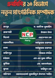 এদিকে, জাতীয় নাগরিক পার্টির (এনসিপি) ১০ জন কেন্দ্রীয় নেতাকে তাদের অন্য সব দায়িত্ব থেকে অব্যাহতি দিয়ে বিভাগীয় সাংগঠনিক সম্পাদকের দায়িত্ব দেওয়া হয়েছে। রংপুর বিভাগে দায়িত্ব পেয়েছেন ড. আতিক মুজাহিদ, রাজশাহীতে ইমরান ইমন, সিলেটে এহতেশাম হক, ময়মনসিংহে আশেকিন আলম, ঢাকায় সাইফুল্লাহ হায়দার, ফরিদপুরে নিজাম উদ্দীন, চট্টগ্রামে এস এম সুজা উদ্দিন, কুমিল্লায় মো. আতাউল্লাহ, খুলনায় ফরিদুল হক এবং বরিশালে অ্যাডভোকেট মুজাহিদুল ইসলাম শাহীন।