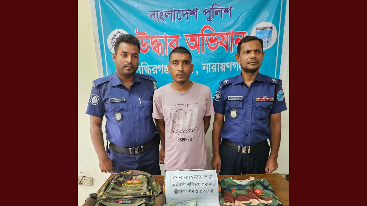 ভুয়া সেনা কর্মকর্তা আটক সেনাবাহিনীর ওয়ারেন্ট অফিসার পরিচয়ে প্রবাসীদের স্ত্রীদের টার্গেট করে প্রেমের ফাঁদে ফেলে ধর্ষণ ও অর্থ লুটের অভিযোগে