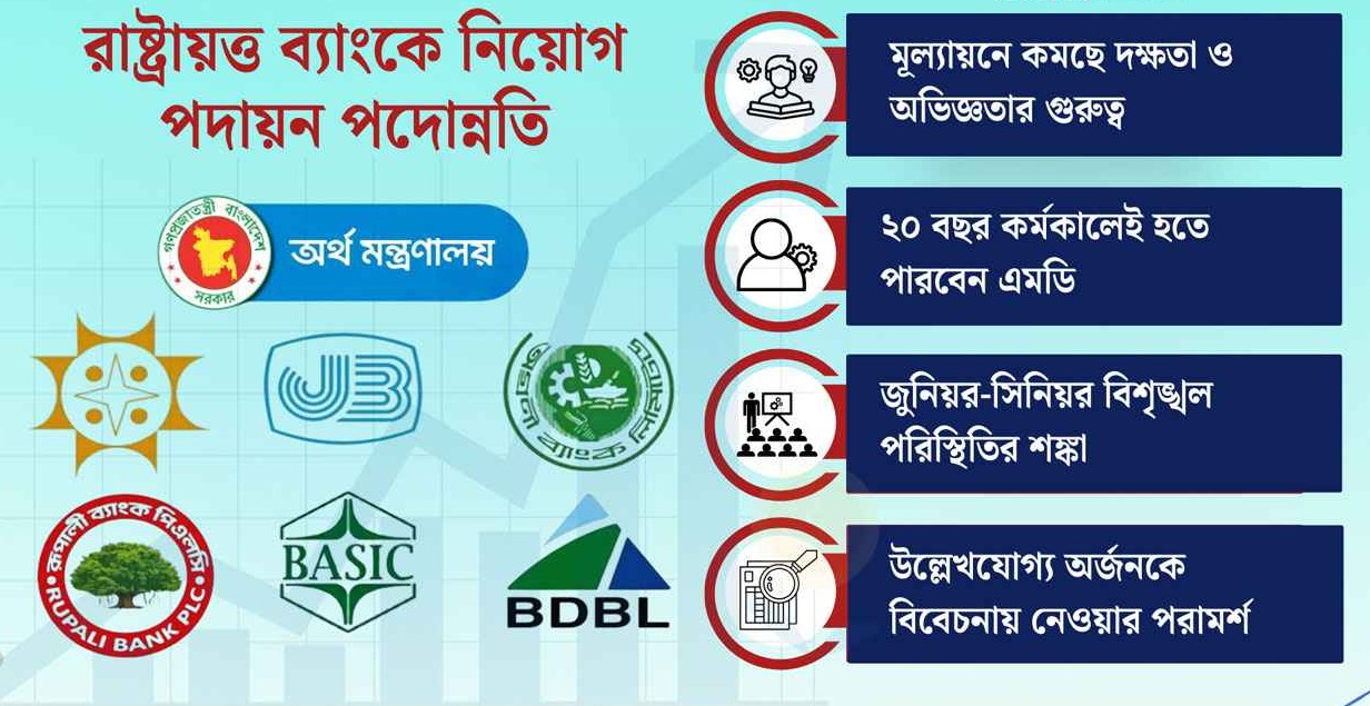 *মূল্যায়নে কমছে দক্ষতা ও অভিজ্ঞতার গুরুত্ব *২০ বছর কর্মকালেই হতে পারবেন এমডি *জুনিয়র-সিনিয়র বিশৃঙ্খল পরিস্থিতির শঙ্কা *উল্লেখযোগ্য অর্জনকে বিবেচনায় নেওয়ার