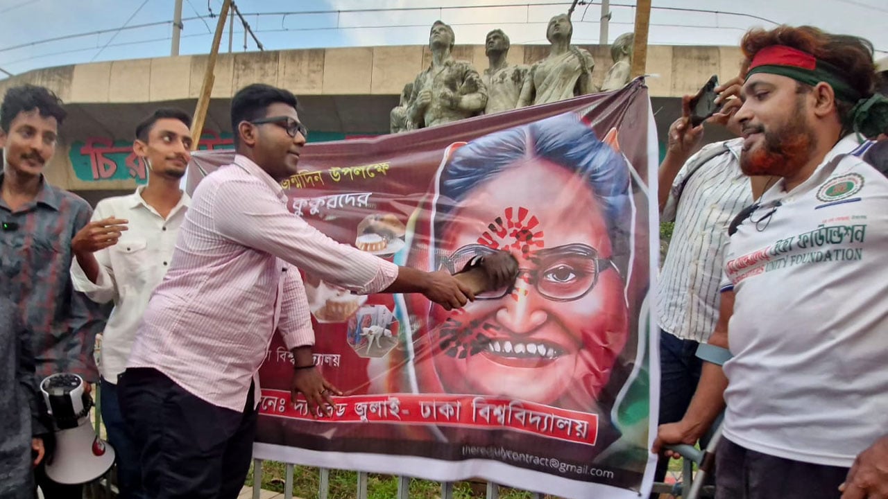 ভারতে পলাতক গণহত্যাকারী শেখ হাসিনার ৭৯ তম জন্মদিনে কুশ পুত্তলিকায় জুতা নিক্ষেপ করেছে শিক্ষার্থীরা। কর্মসূচিতে অংশগ্রহণকারীরা ‘শুভ শুভ শুভদিন’, ‘খুনি